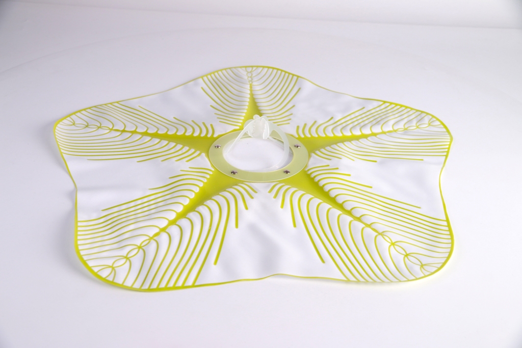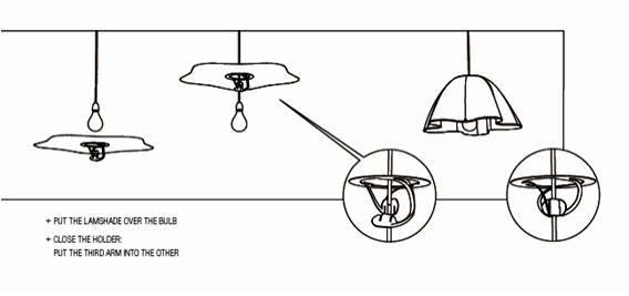 Form und Material vermitteln eine Leichtigkeit und Flexibilität, deren Stabilität durch den Druck gewährleistet ist ohne jedoch dadurch steif zu wirken. Die Montage erfolgt mit wenigen Handgriffen direkt oberhalb der Glühbirne am Kabel.