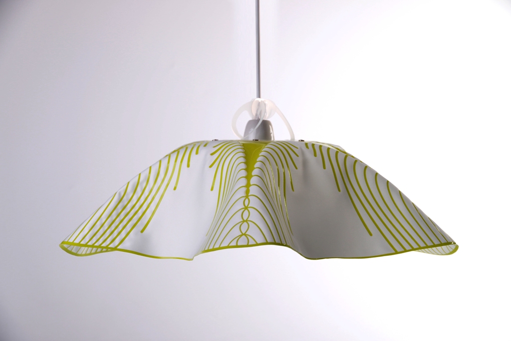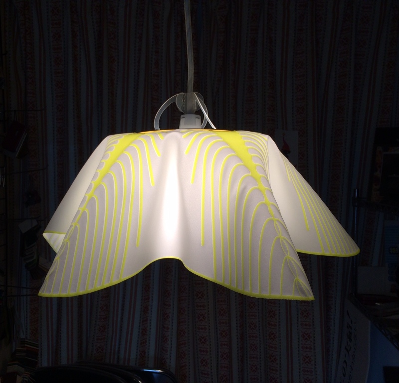 Das 3D-Druckverfahren gibt dem Stoff des Lampenschirms Horatio gelb die entsprechende Form.
