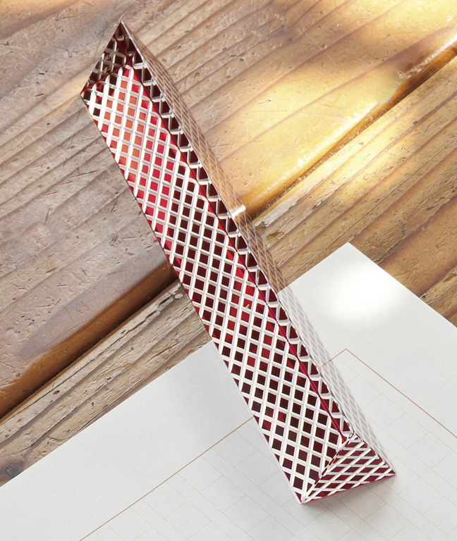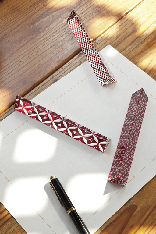Die traditionelle Handwerkskunst um diese Muster herzustellen wurde über Generationen hinweg weitergegeben und verfeinert. Um diese Kunst der japanischen Glasbearbeitung, Edo Kiriko, auch für zukünftige Generationen einzufangen, entwarf Hirota Glass den gläsernen Briefbeschwerer Urushi, der die Traditionen der Glasbearbeitung vereint und einfängt und tagtäglich auf Ihrem Schreibtisch bewundert werden kann und sich sogar als Lineal eignet um gerade Linien zu ziehen. Dieser gläserne Briefbeschwerer kombiniert die Eigenschaften eines dreieckigen Prismas mit der Optik von Glas, was zu beeindruckenden und wunderschönen Reflektionen führt je nachdem wie man den Briefbeschwerer neigt und dreht. Die tiefrote Lackierung nach der traditionellen Aizu-Nuri Lackiertechnik betont die Hochwertigkeit der Arbeit nochmals und führt zusammen mit Form und Material zu dieser beeindruckenden Optik.